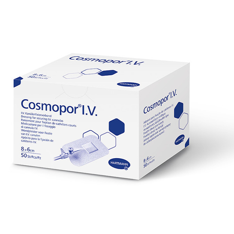 Cosmopor I.V. ist ein selbsthaftender, steriler Kanülenfixierverband aus hypoallergenen, hautfreundlichen Materialien mit einem nicht verklebenden Wundkissen. Er gewährleistet eine zuverlässige Fixierung der Venenverweilkanüle und bietet einen sicheren Wundverband.. Er gewährleistet eine zuverlässige Fixierung der Venenverweilkanüle und bietet einen sicheren Wundverband.