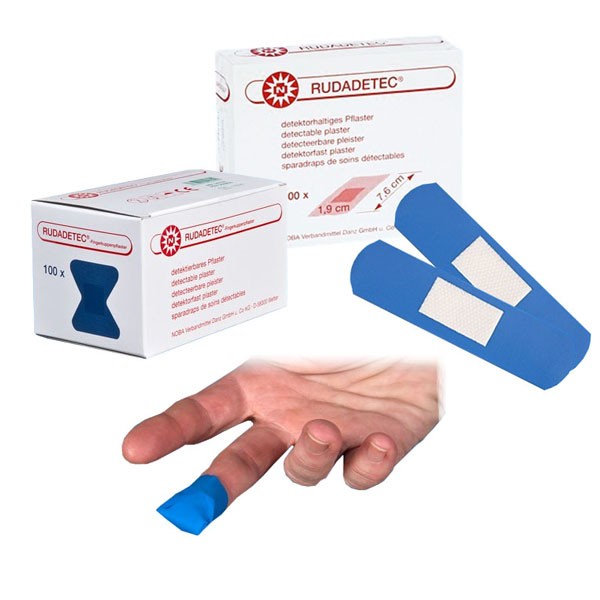 Speziell für den Lebensmittelbereich hergestellte, blaue Pflasterstrips mit eingearbeiteten Aluminiumstreifen, die die Pflaster detektierbar machen. Für primär heilende kleinere Wunden.